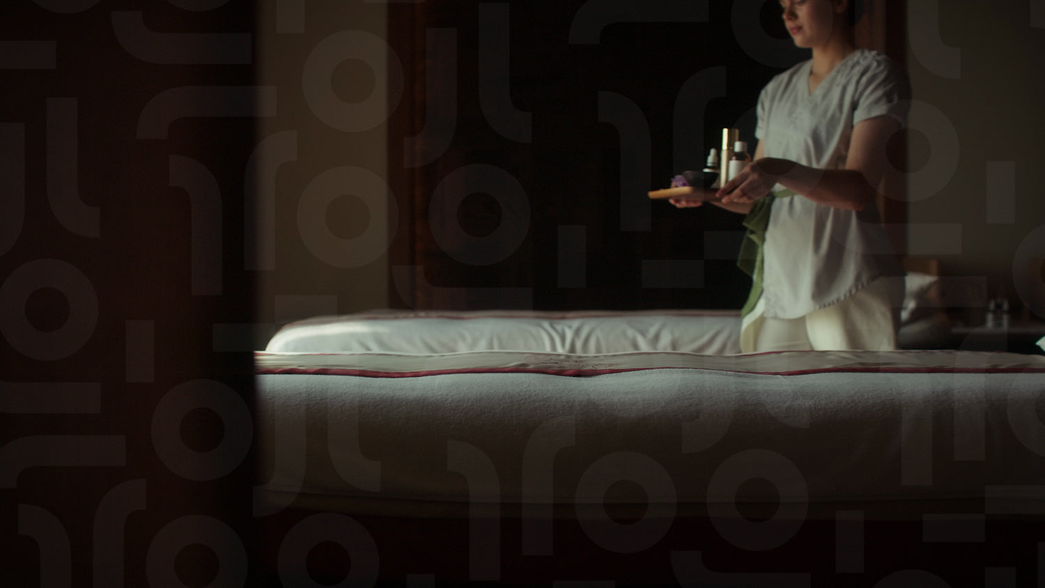 A spa therapist prepares a luxurious massage bed with essential oils, setting the scene for relaxation and wellness. The tranquil atmosphere invites a peaceful and rejuvenating experience.