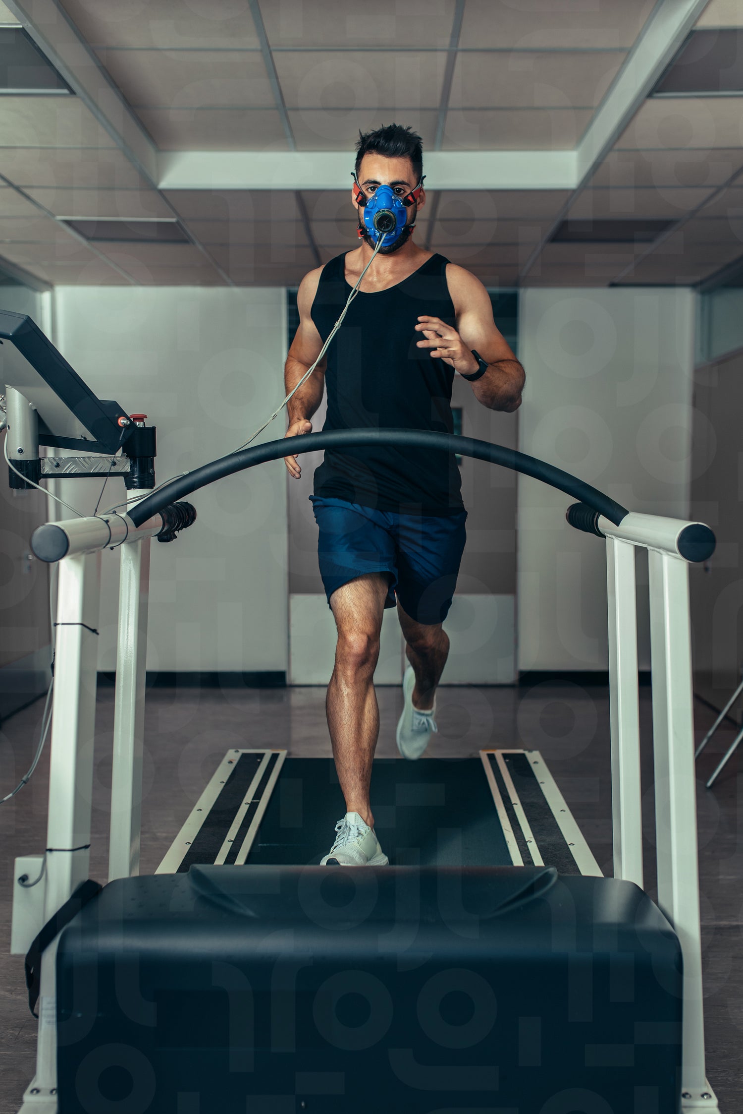 Male runner wearing mask on treadmill in sports science laboratory. Sports man running on treadmill and monitoring his fitness performance.