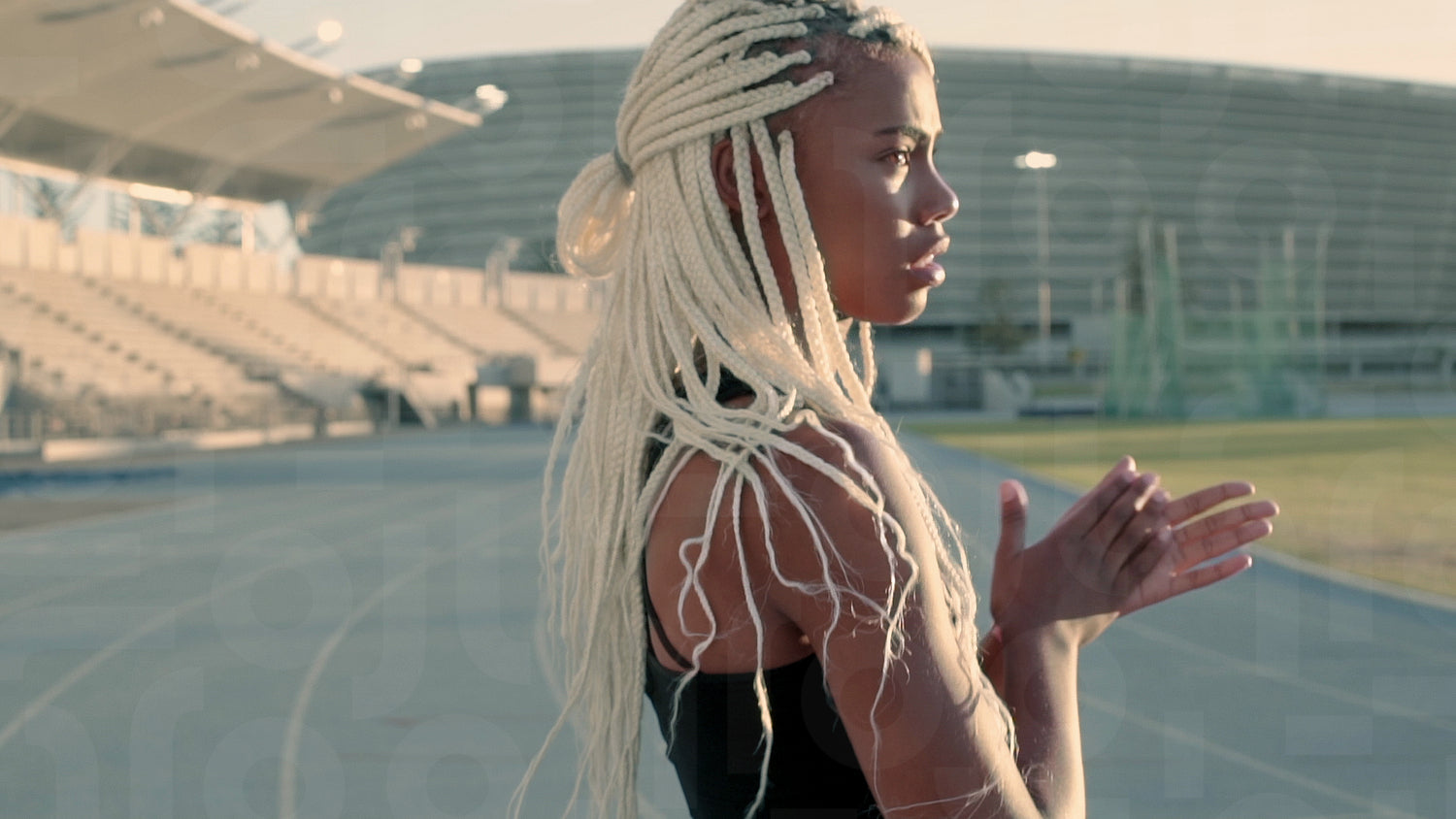 African sportswoman with braided blond hair walking across the running track rubbing her hands. Female feeling cold during training session in stadium.