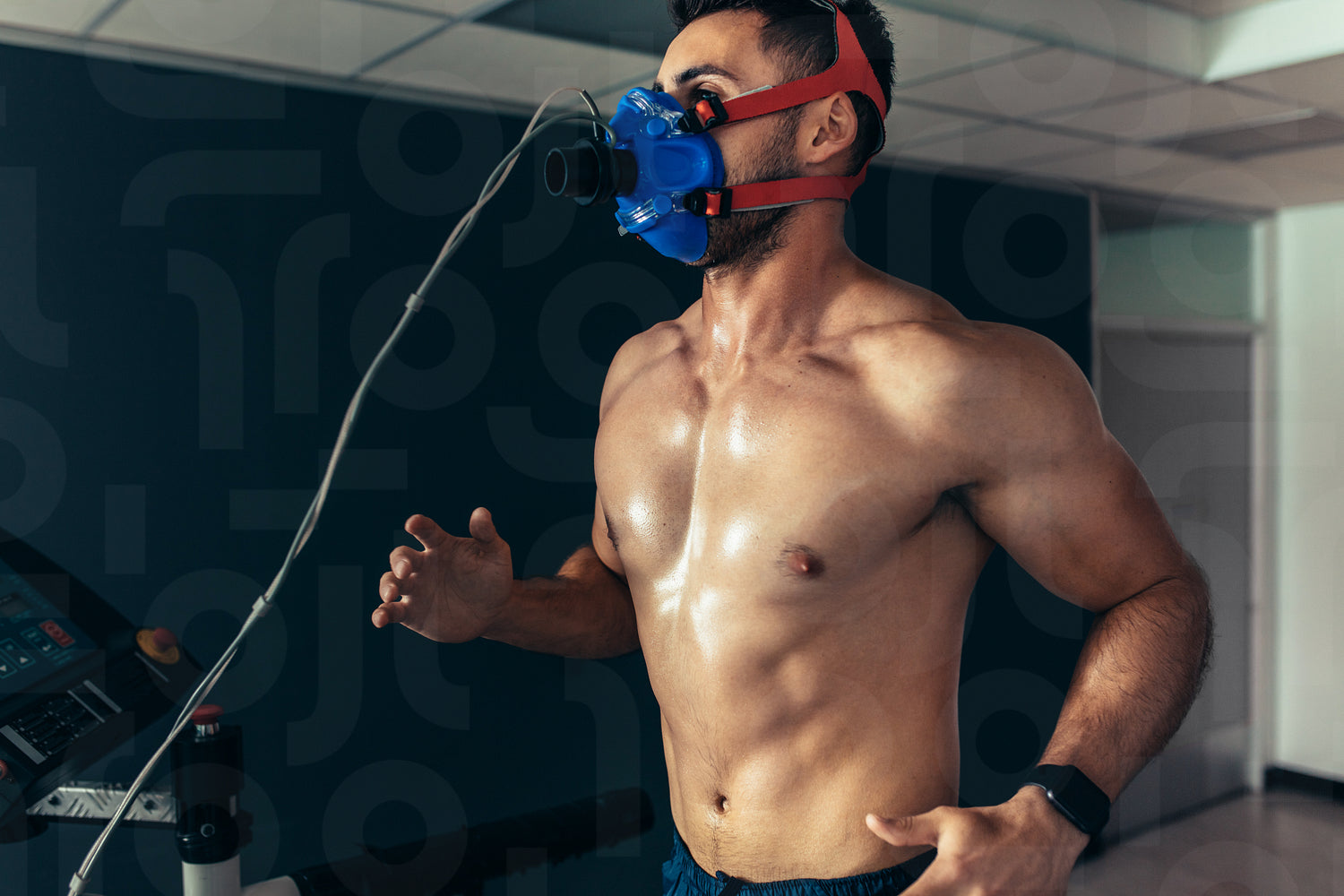 Muscular athlete with mask running on treadmill in gym for monitoring his performance. Sportsman in sports science lab measuring his performance.