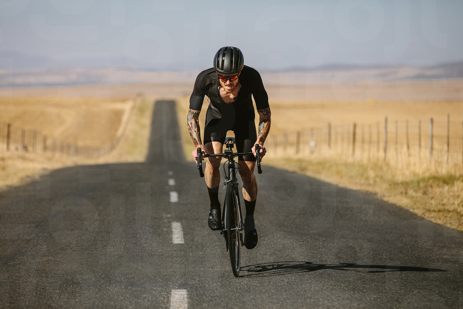 Sportsman riding bicycle on the long road. Professional athlete cycling on countryside highway.