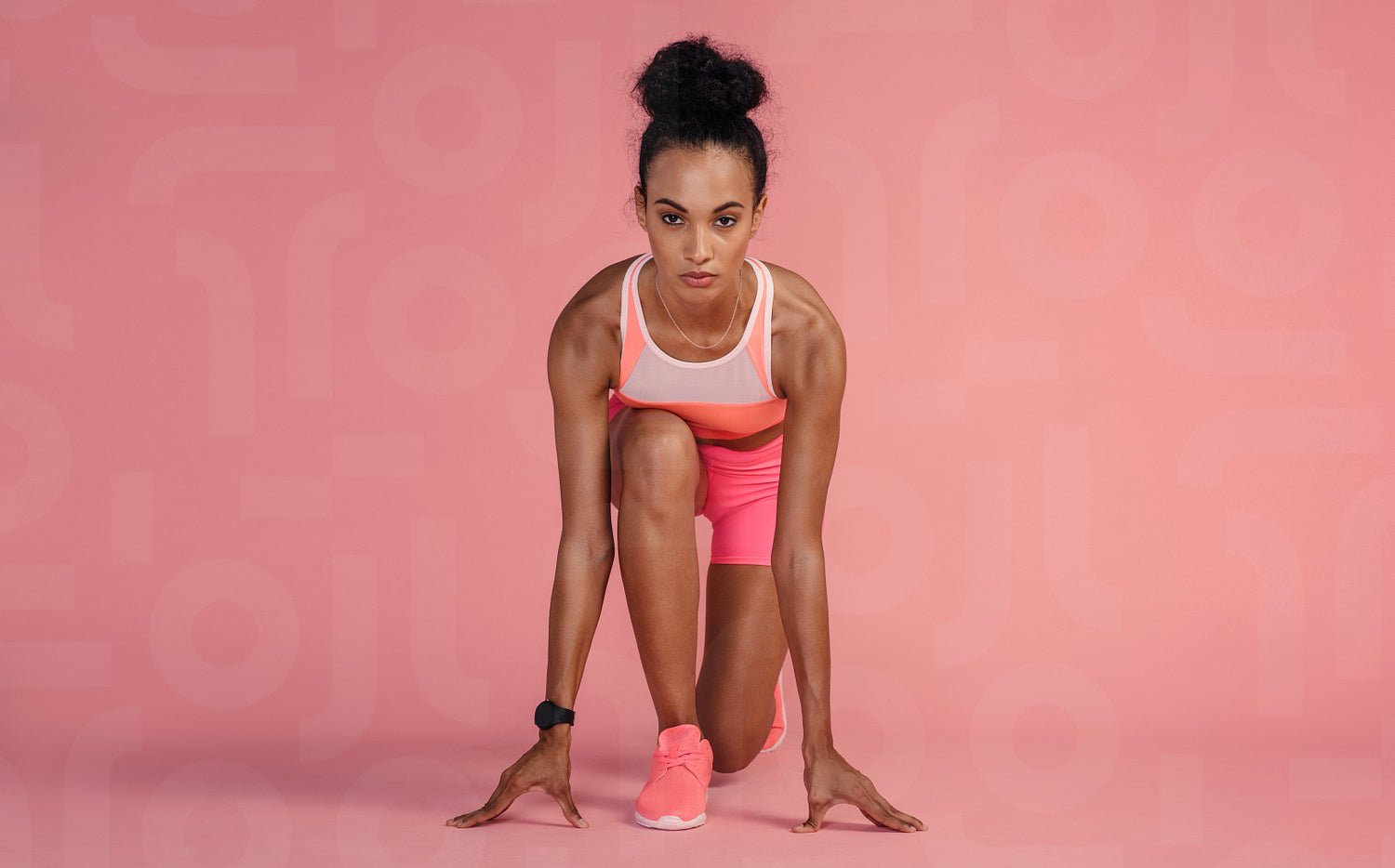 Fit young woman standing in start position over pink background. Sportswoman about to start a run.