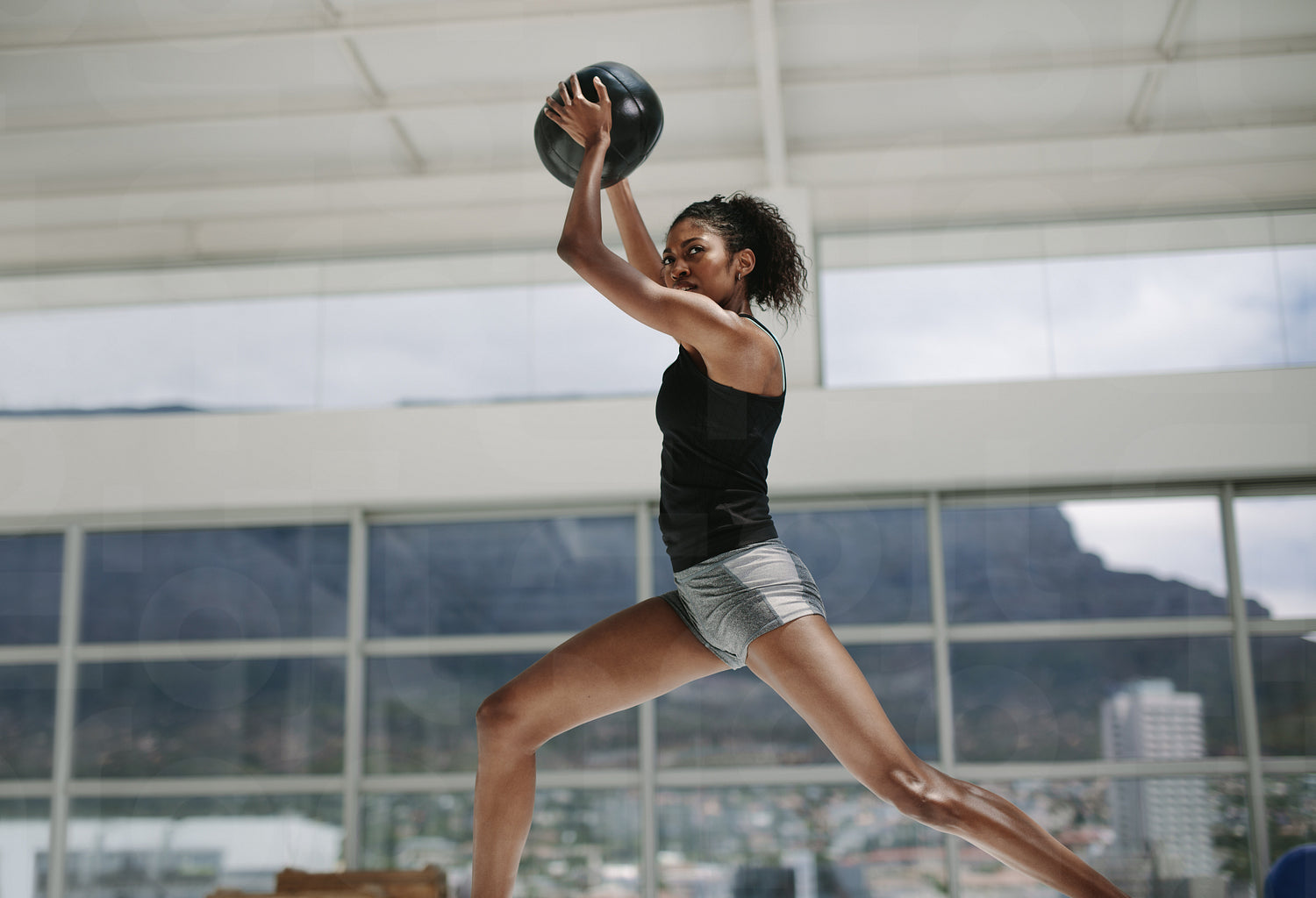 Sportswoman doing exercise with fitness ball. Female exercising and stretching with medicine ball at fitness studio.