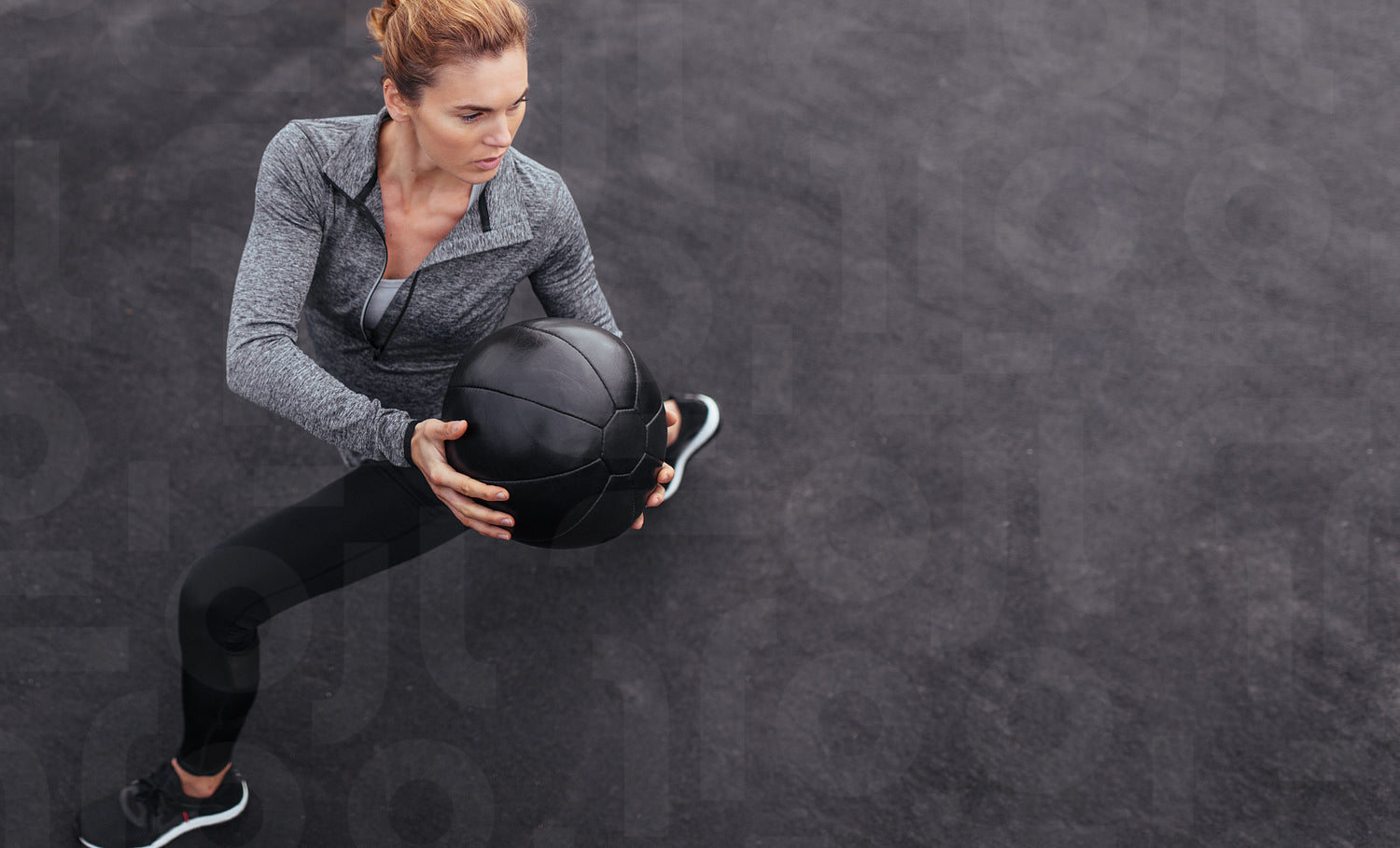 Fitness woman working out at outdoors gym using medicine ball. Sportswoman stretching outdoors with medicine ball. Copyspace for text.