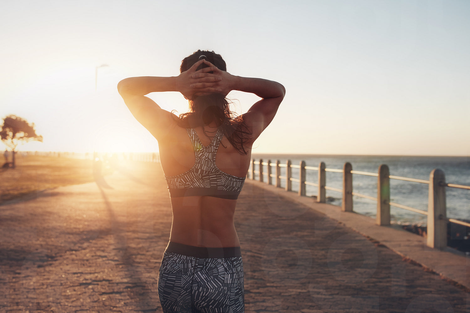 Rear view image of relaxed woman in sportswear walking along the sea with her hands on her head. Sportswoman taking a walk by the sea at sunset.