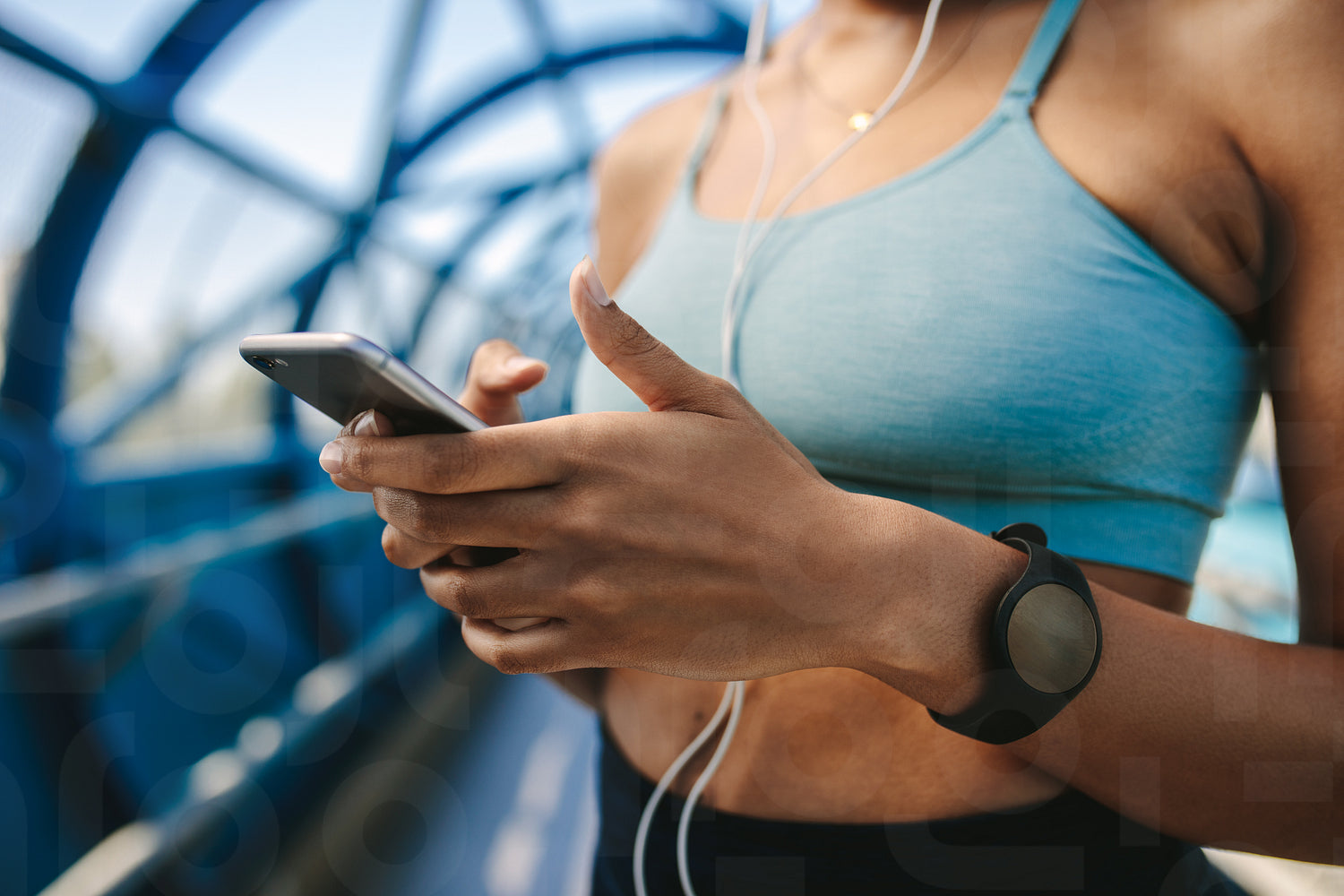 Cropped image of woman in sportswear using mobile phone. Focus on hands and smart phone.