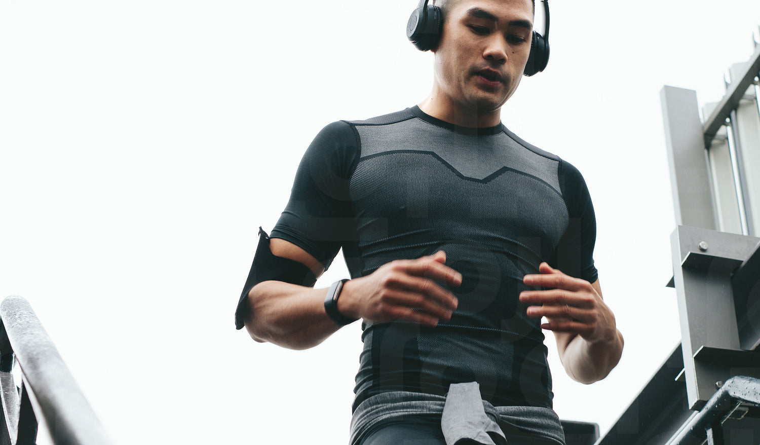 Asian man moving down the stairs as a part of exercise routine. Young man in sports clothing with headphones working out outside on steps.