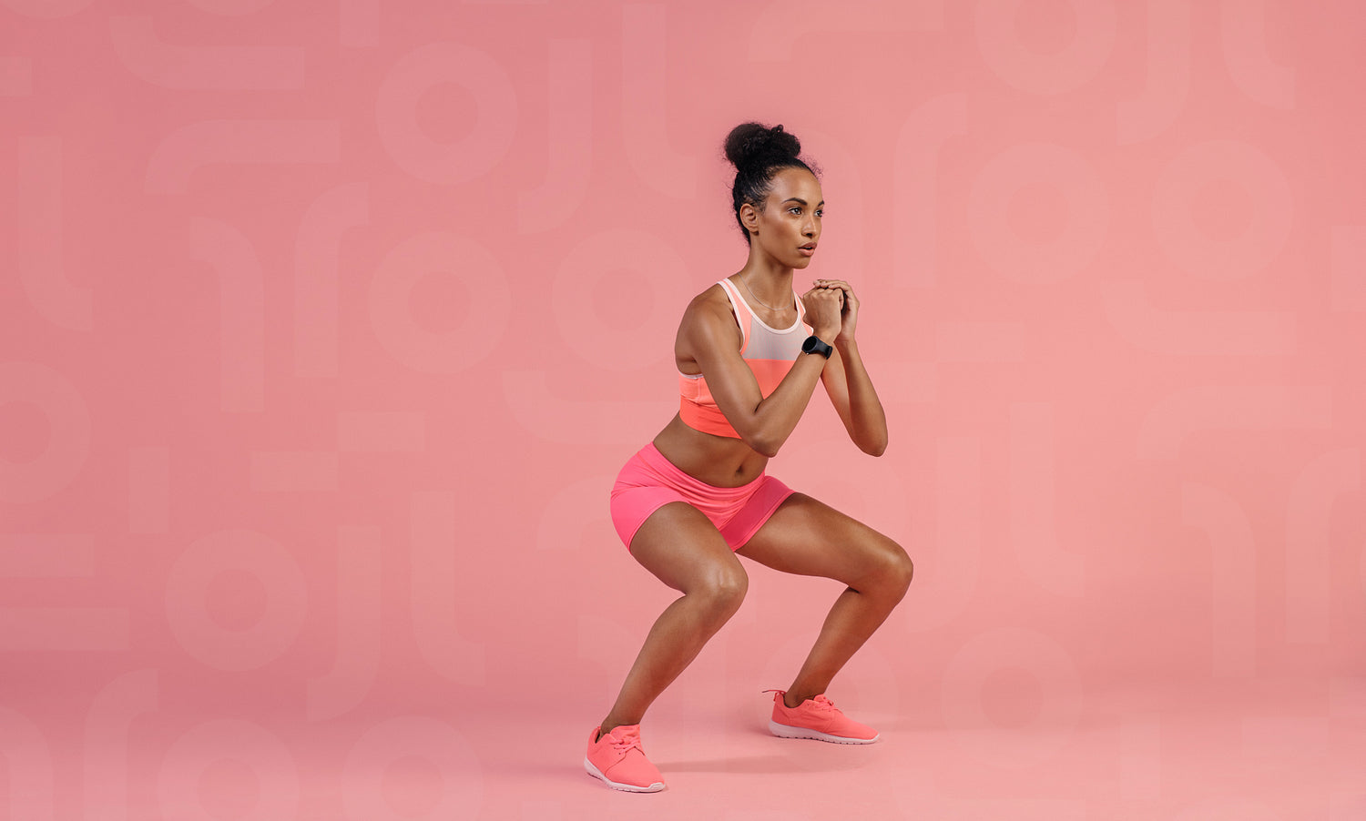 Sporty woman practicing squat exercises in studio. African woman in sportswear working out on pink background.