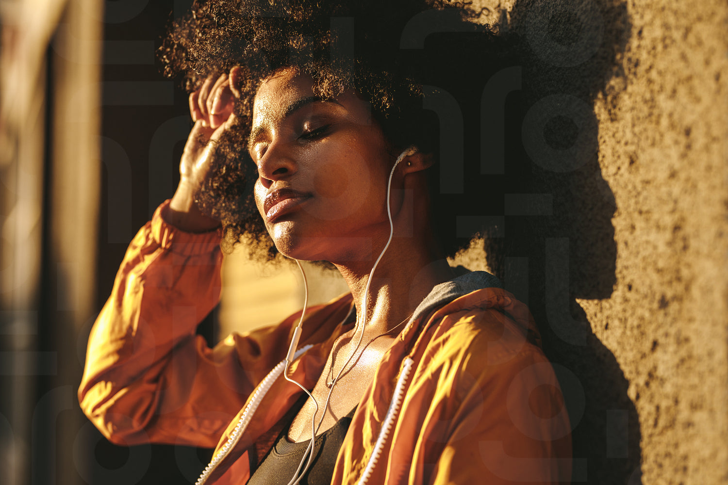 Sporty woman relaxing after running exercise. Fit woman listening to music on earphones and leaning to a wall outdoors with her eyes closed.