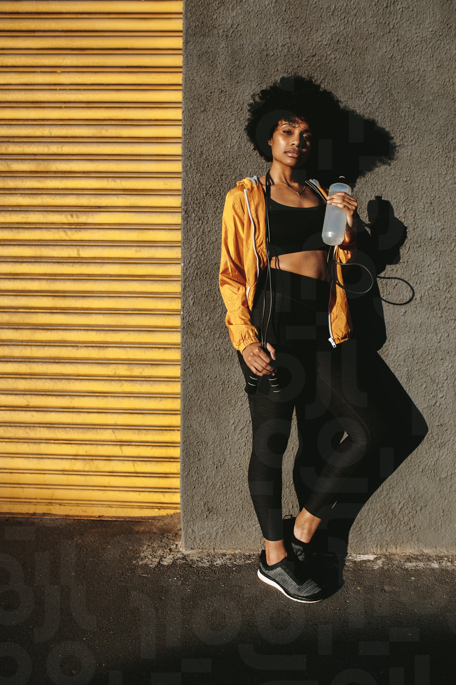 Healthy young woman with water bottle standing against a wall. Full length shot of sporty young woman relaxing after running exercise outdoors.