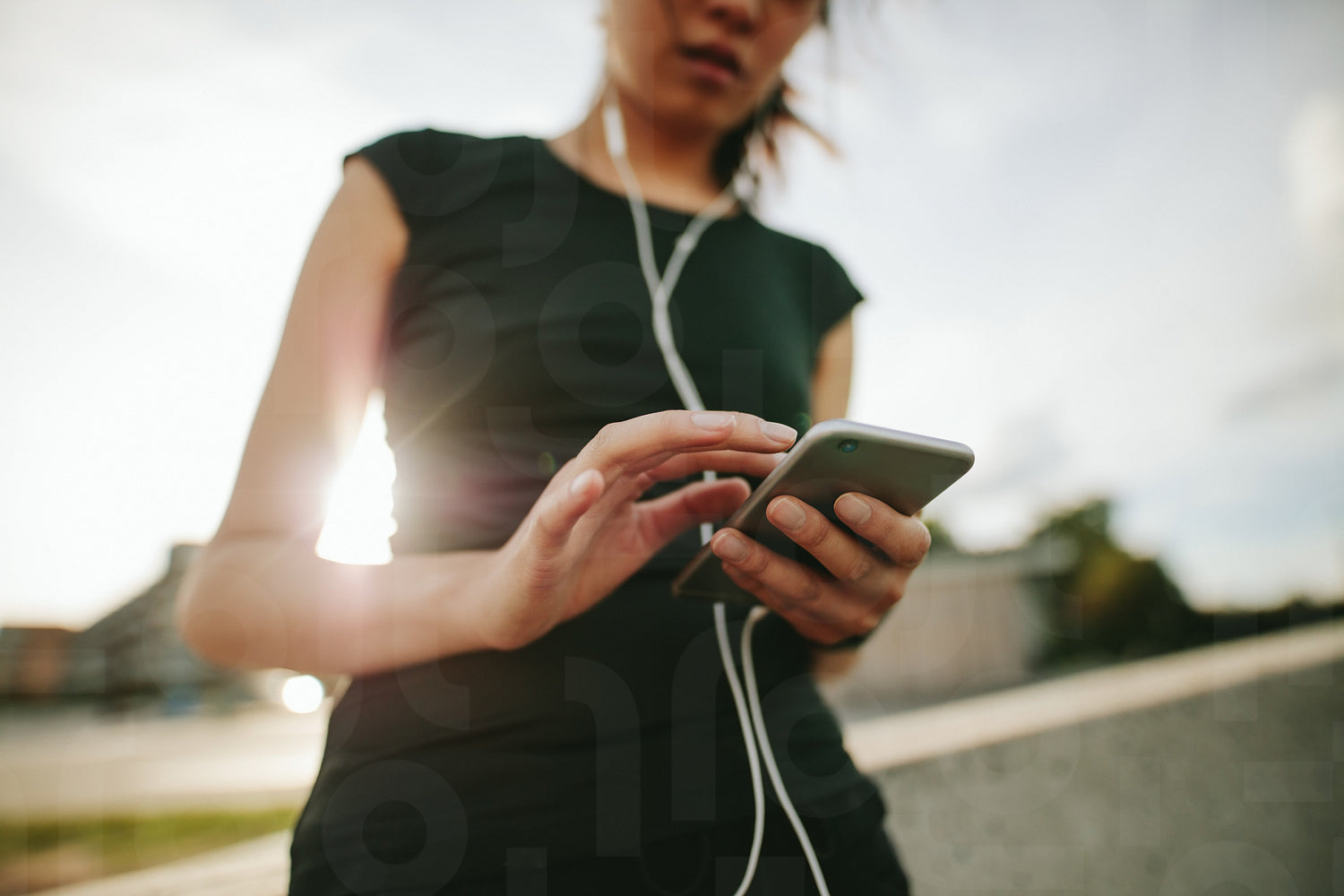 Portrait of sporty young woman taking a break after running outdoors. Female hands using mobile phone.