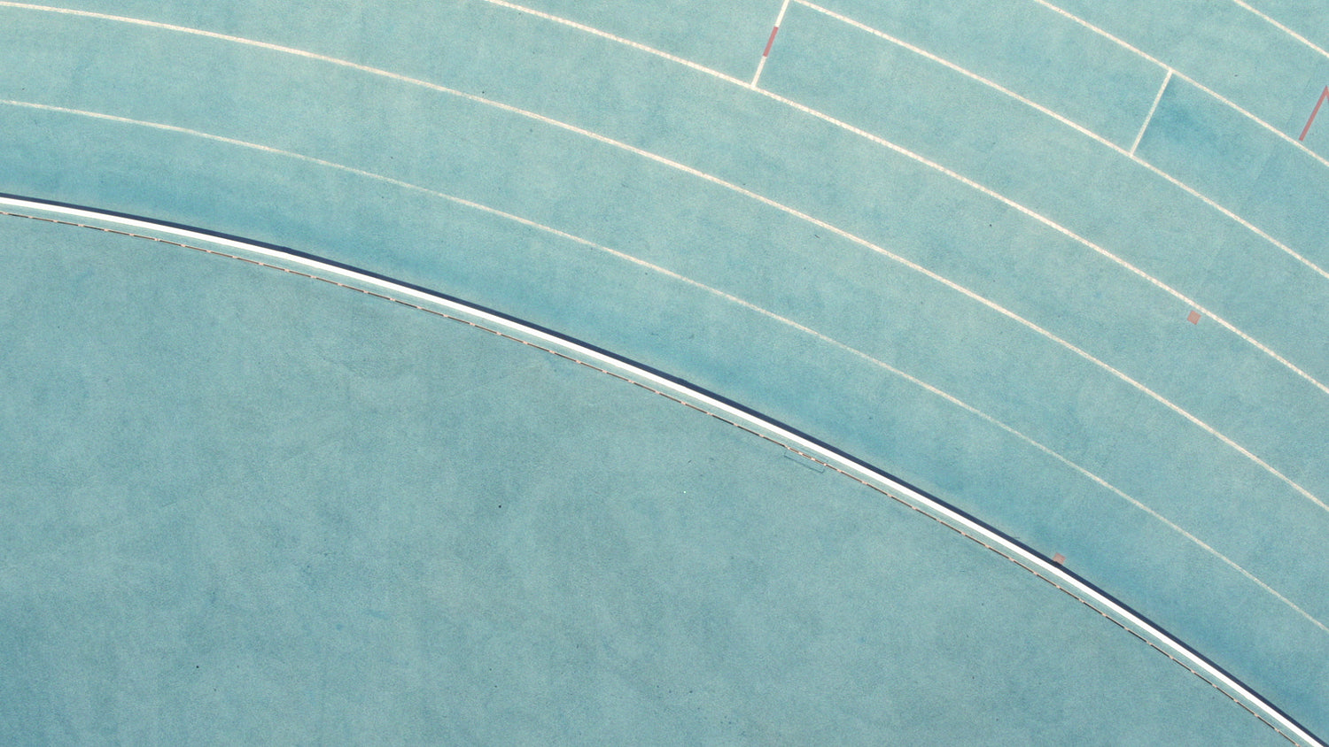 Aerial view of sprinter practicing on all weather racetrack with a parachute. Top view of woman athlete with parachute attached to her body running on track.