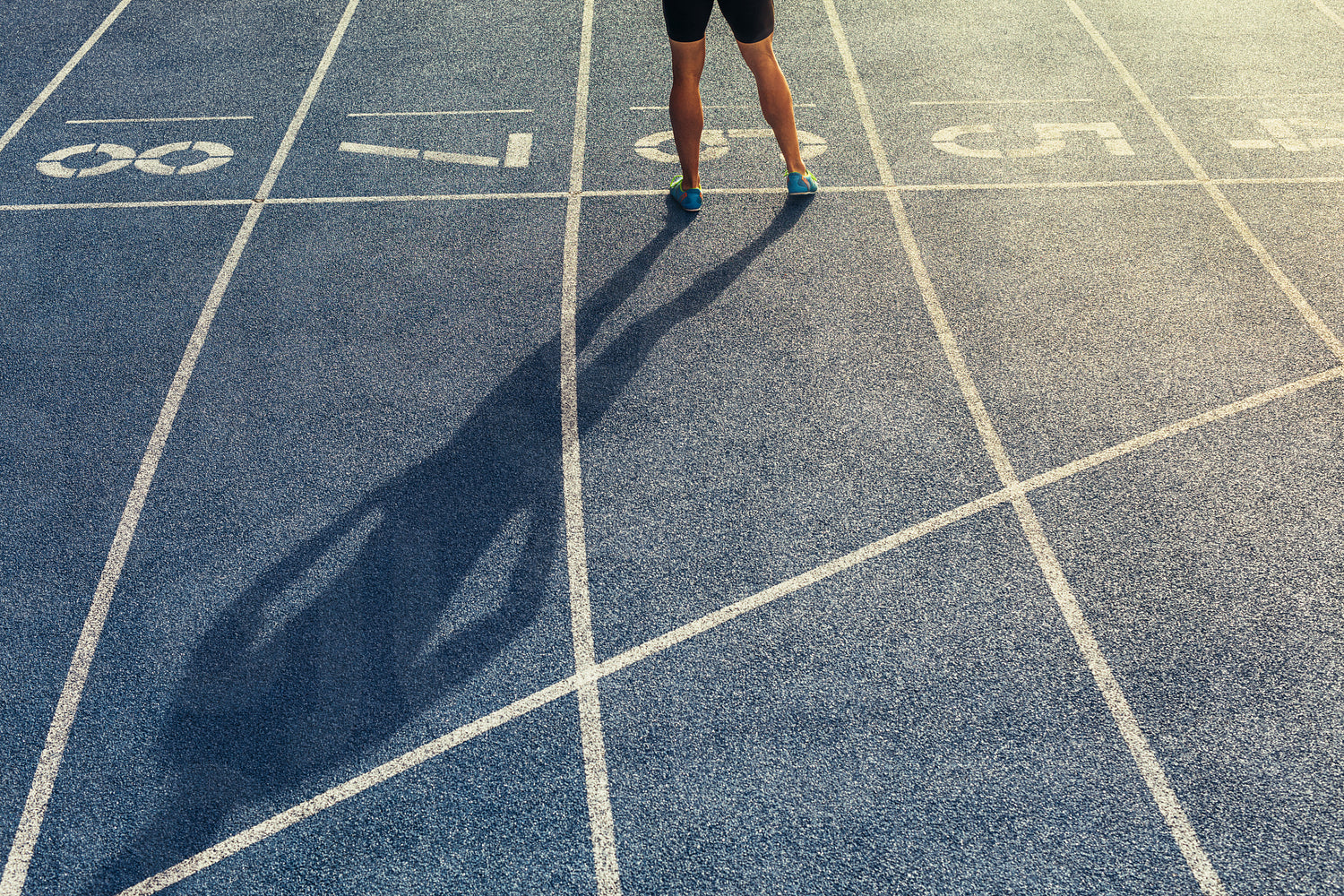 Rear view of legs of athlete standing on an all-weather running track. Shadow of a runner standing at the start line with hands on waist.