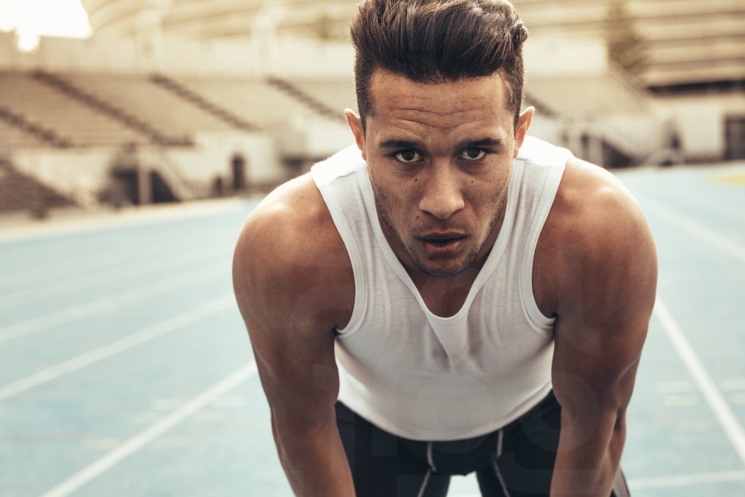 Close up of a runner standing on a running track resting his hands on knees. Athlete relaxing after a run standing on the track.