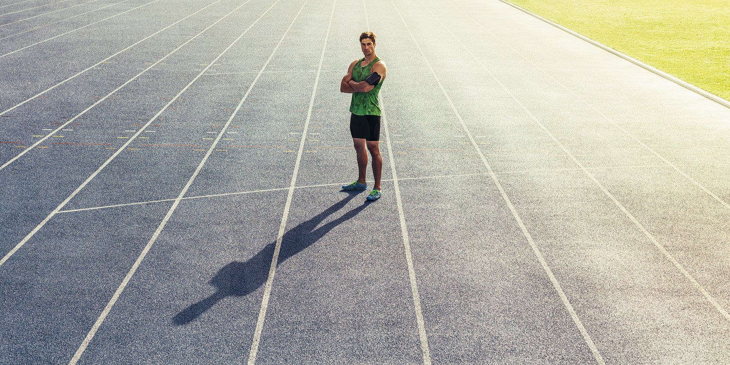 Runner standing on running track with hands folded. Athlete wearing earphones with mobile phone fixed in arm band.