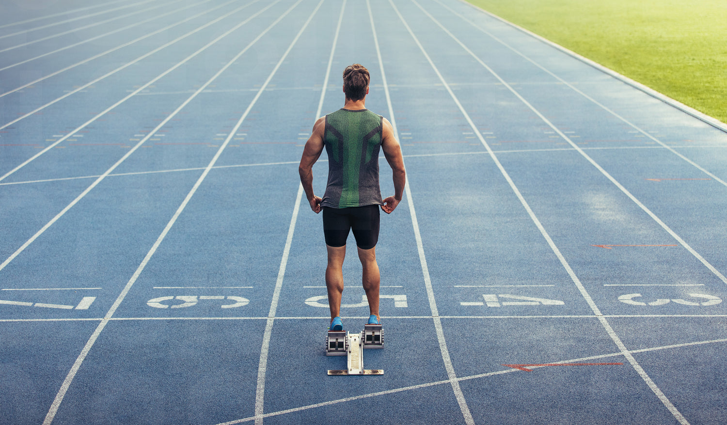 Rear view of an athlete ready to sprint on an all-weather running track. Runner using a starting block to start his run on race track.