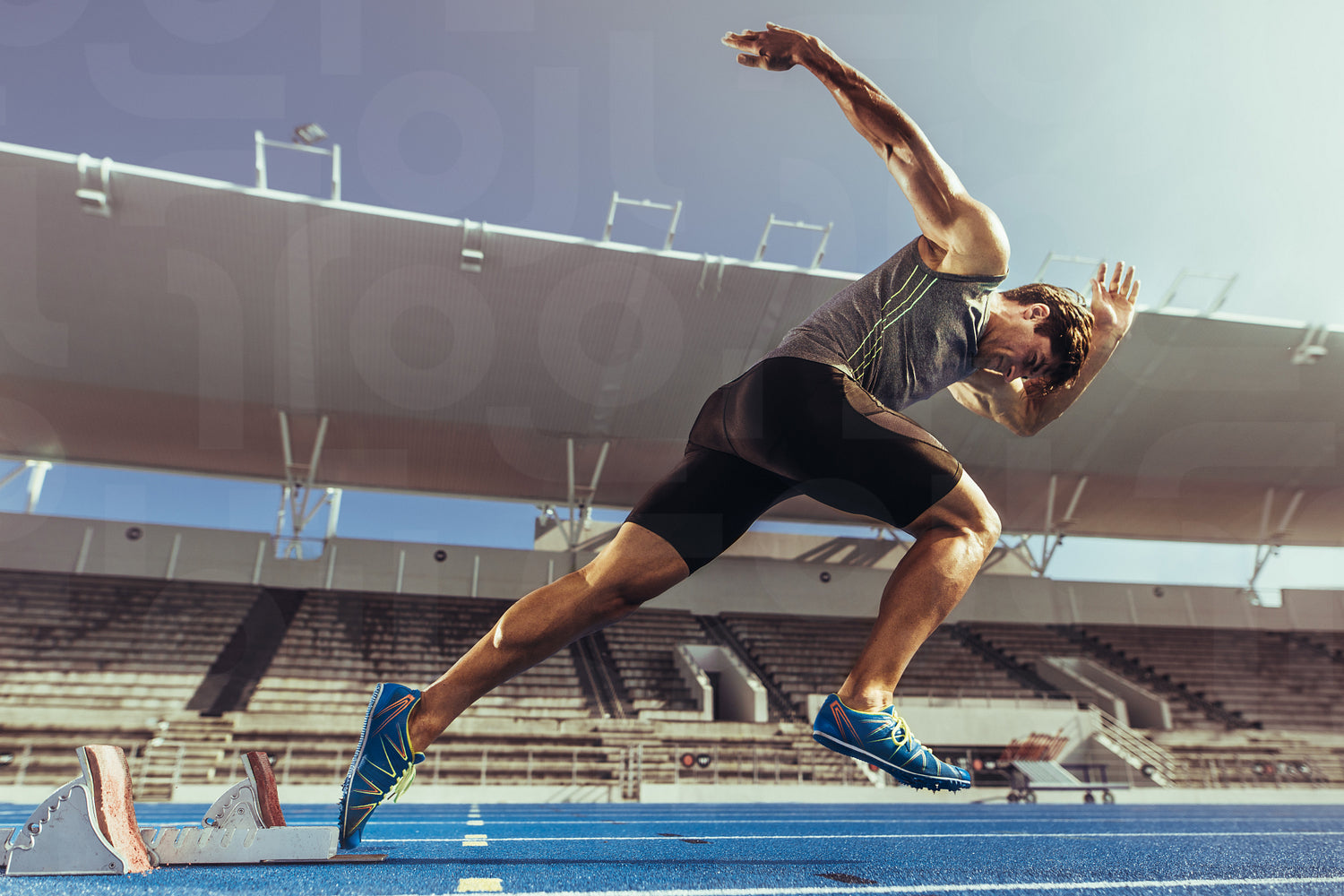 Athlete starting his sprint on an all-weather running track. Runner using starting block to start his run on running track in a stadium.