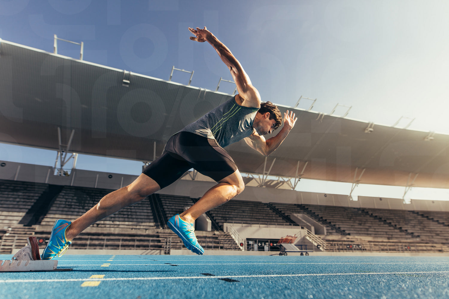 Sprinter taking off from starting block on running track