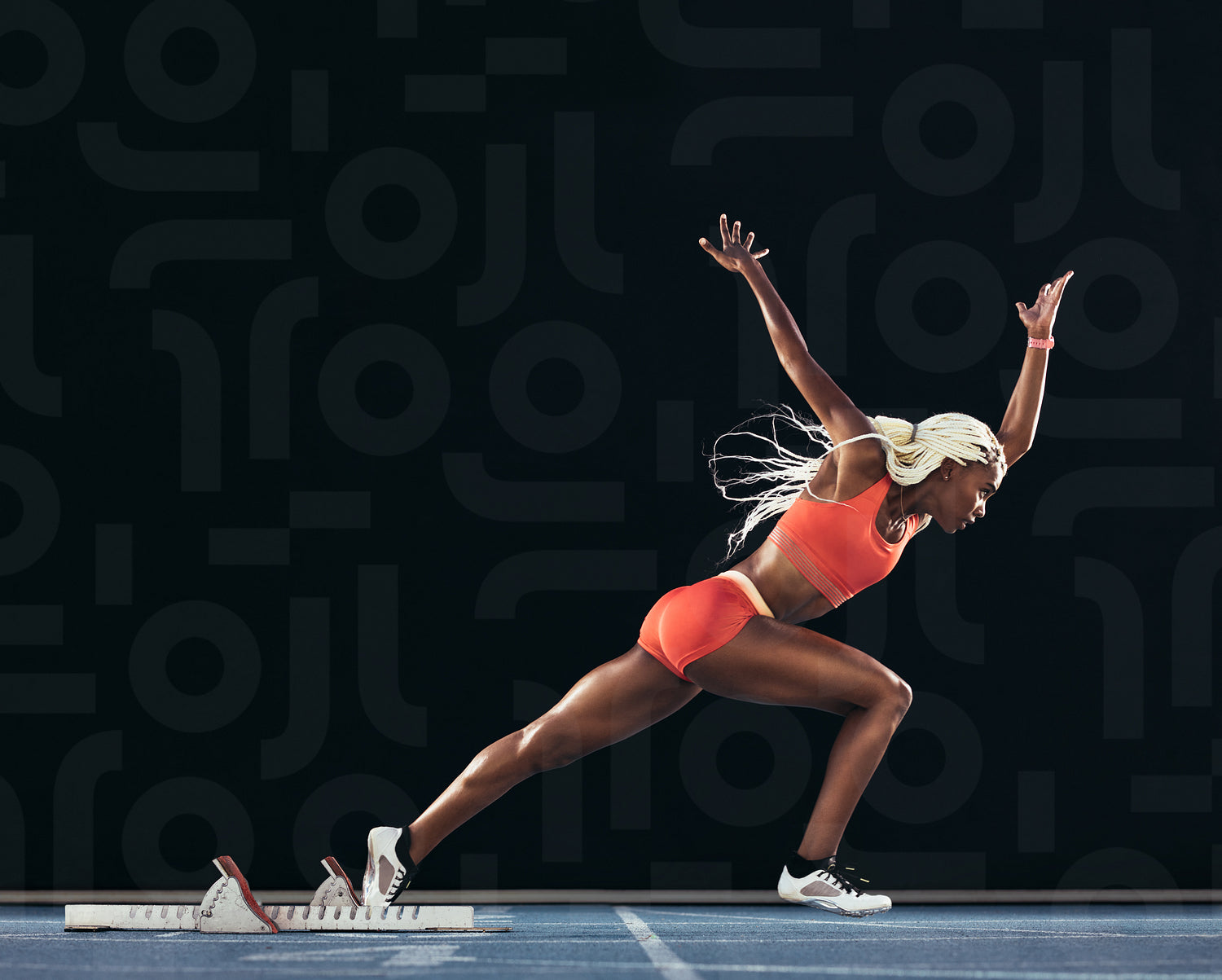 Side view of a female athlete starting her sprint on an all-weather running track on a black background. Runner using starting block to start her run on a running track.