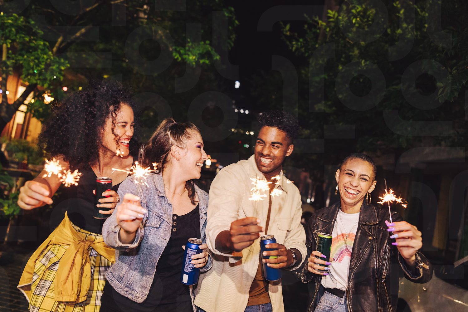 Starting the festive season with sparklers. Four happy young people holding up their bengal lights at night. Group of cheerful city friends laughing and having a good time together.