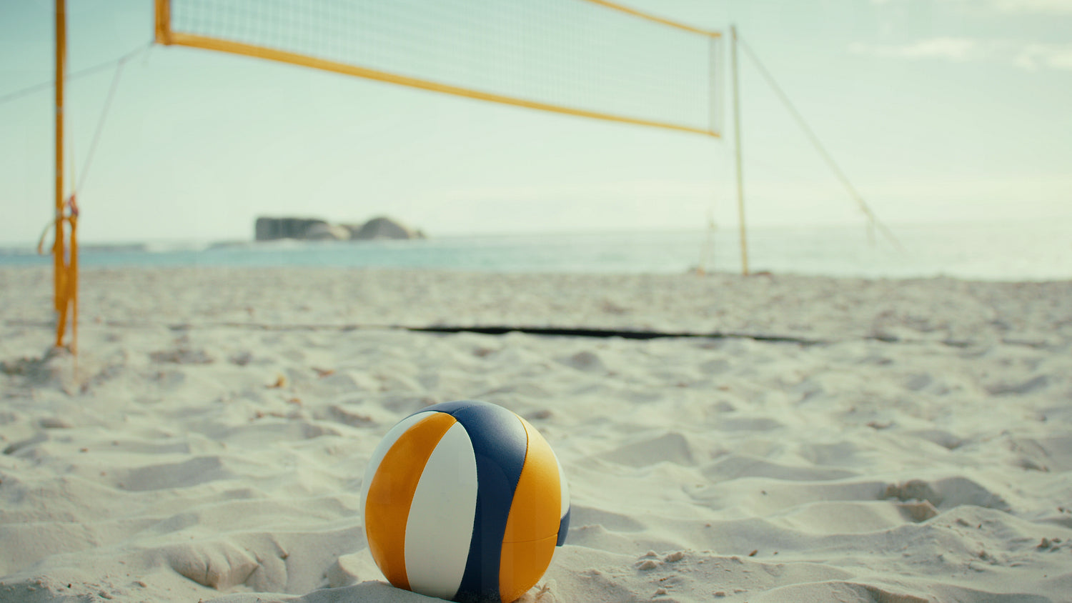 A static wide shot of an empty beach volleyball court, with a volleyball lying in the sand in the foreground and the net visible in the background.