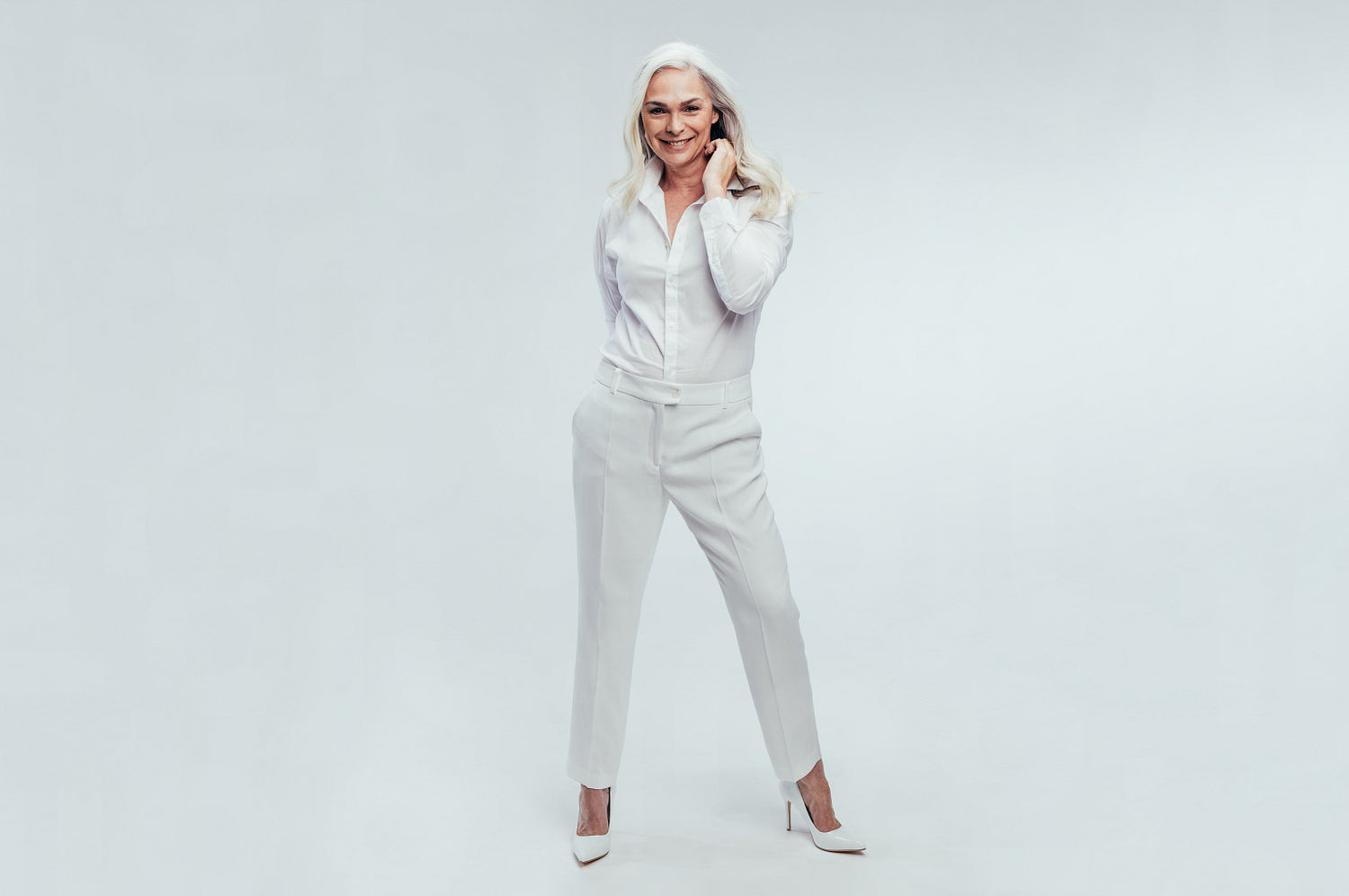 Full length portrait of beautiful senior woman standing over white background. Stylish mature woman posing in white casuals.
