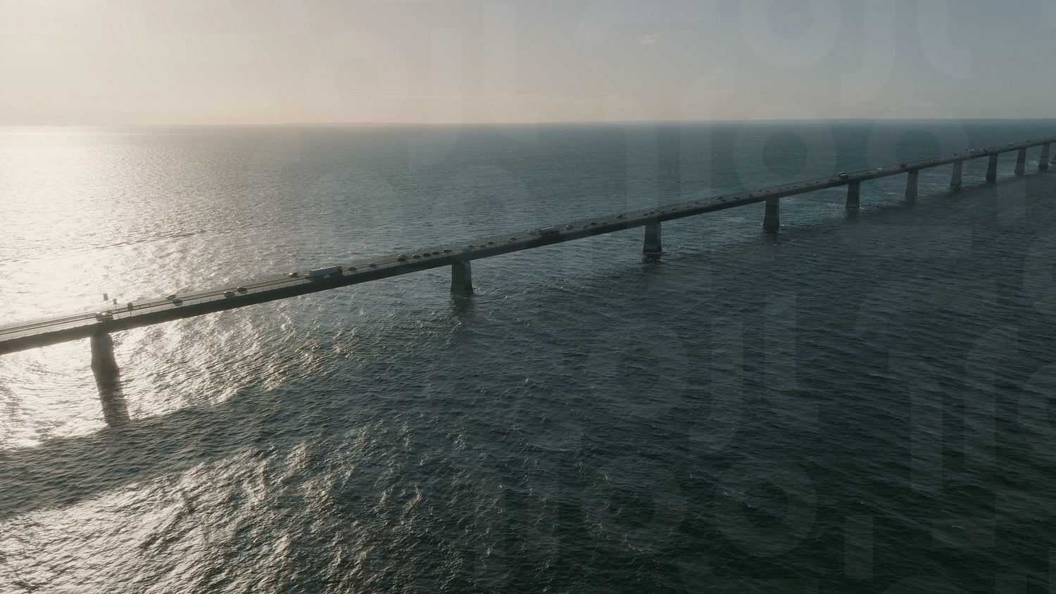 Storebæltsbroen Bridge at sunset, with a flow of coastal traffic on the roadway
