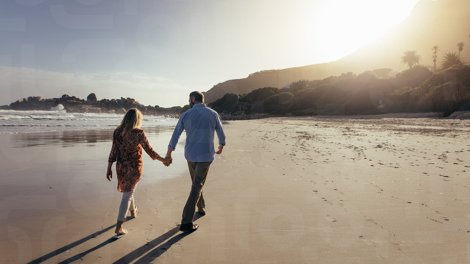 Rear view of romantic senior couple walking hand in hand on the beach. Mature man and woman taking a walk along the sea shore.