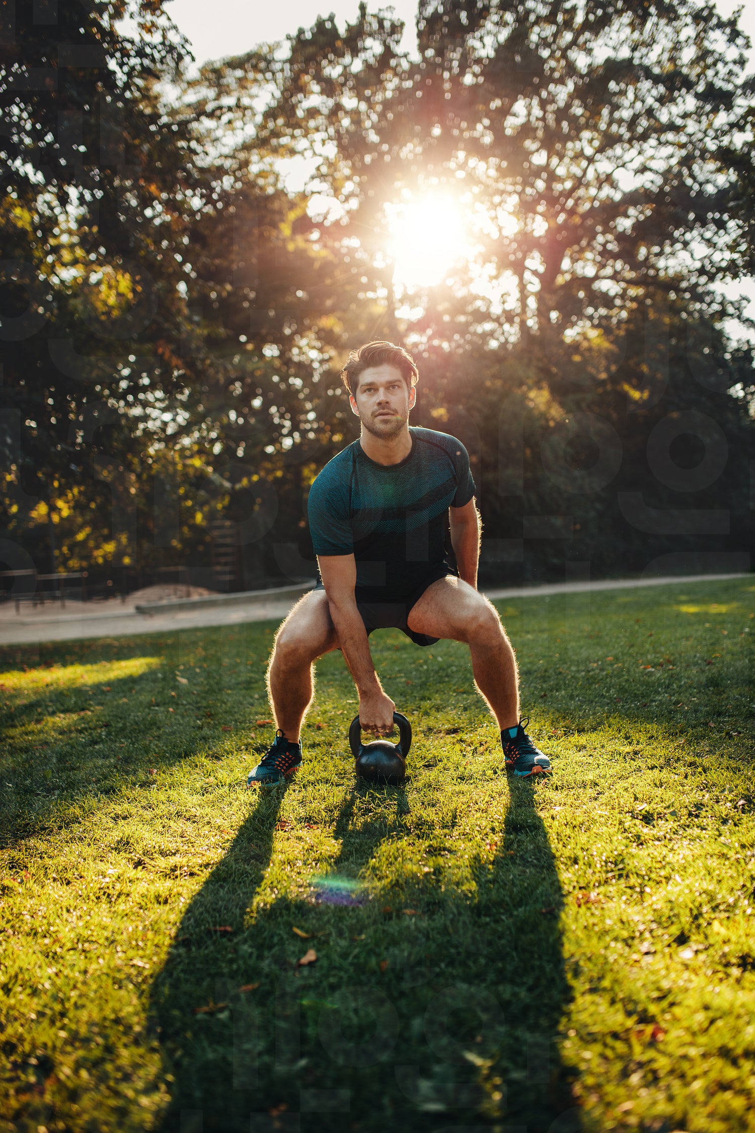 Vertical shot of strong young man exercising with kettle bell weights in the park. Fit and muscular man training at park in morning.