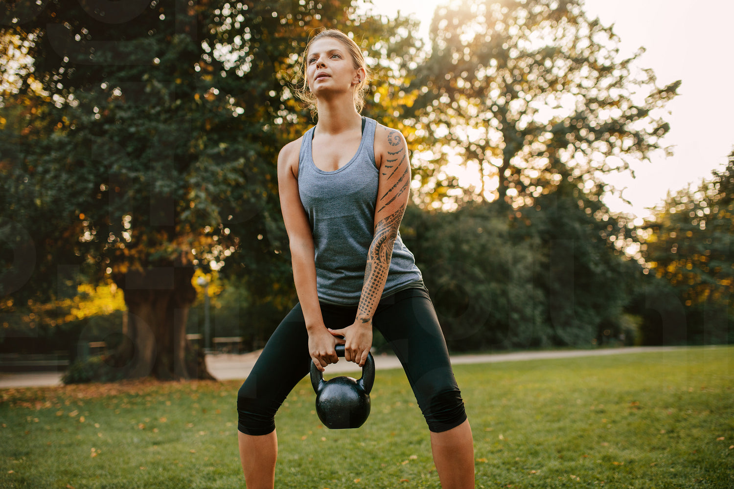 Portrait of strong young woman exercising with kettlebell weights in the park. Fit and muscular woman training at city park in morning.