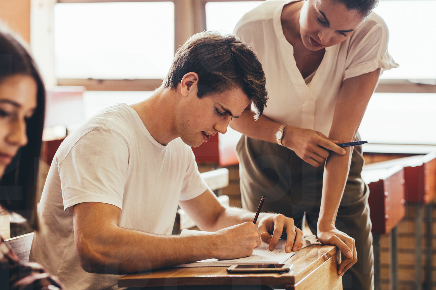 University student being helped by female lecturer during class. Young man writing in his book with a female teacher standing by.