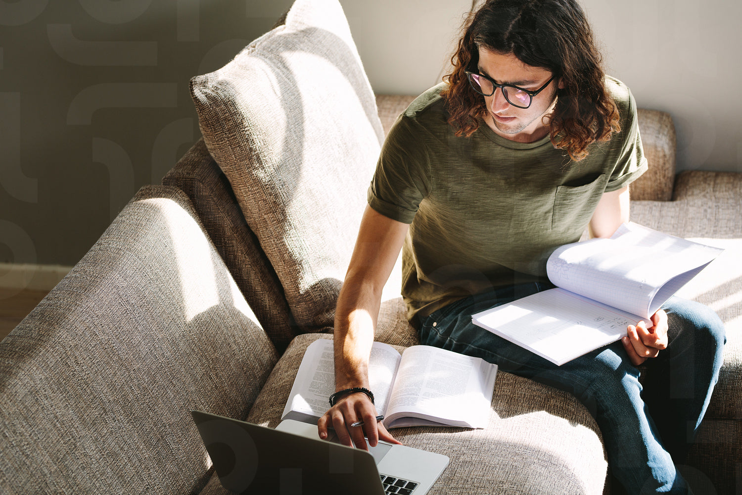 Male student looking at a laptop while studying. Student preparing for college exams sitting at home.