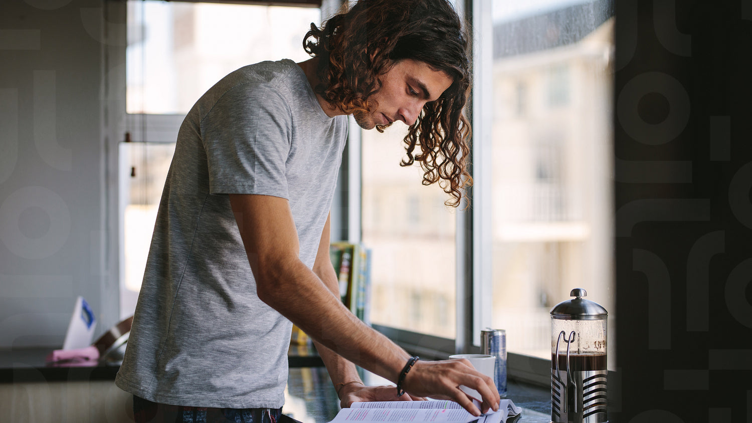 Young man standing in kitchen beside a window and reading a book. Student studying for exam while making coffee in kitchen.