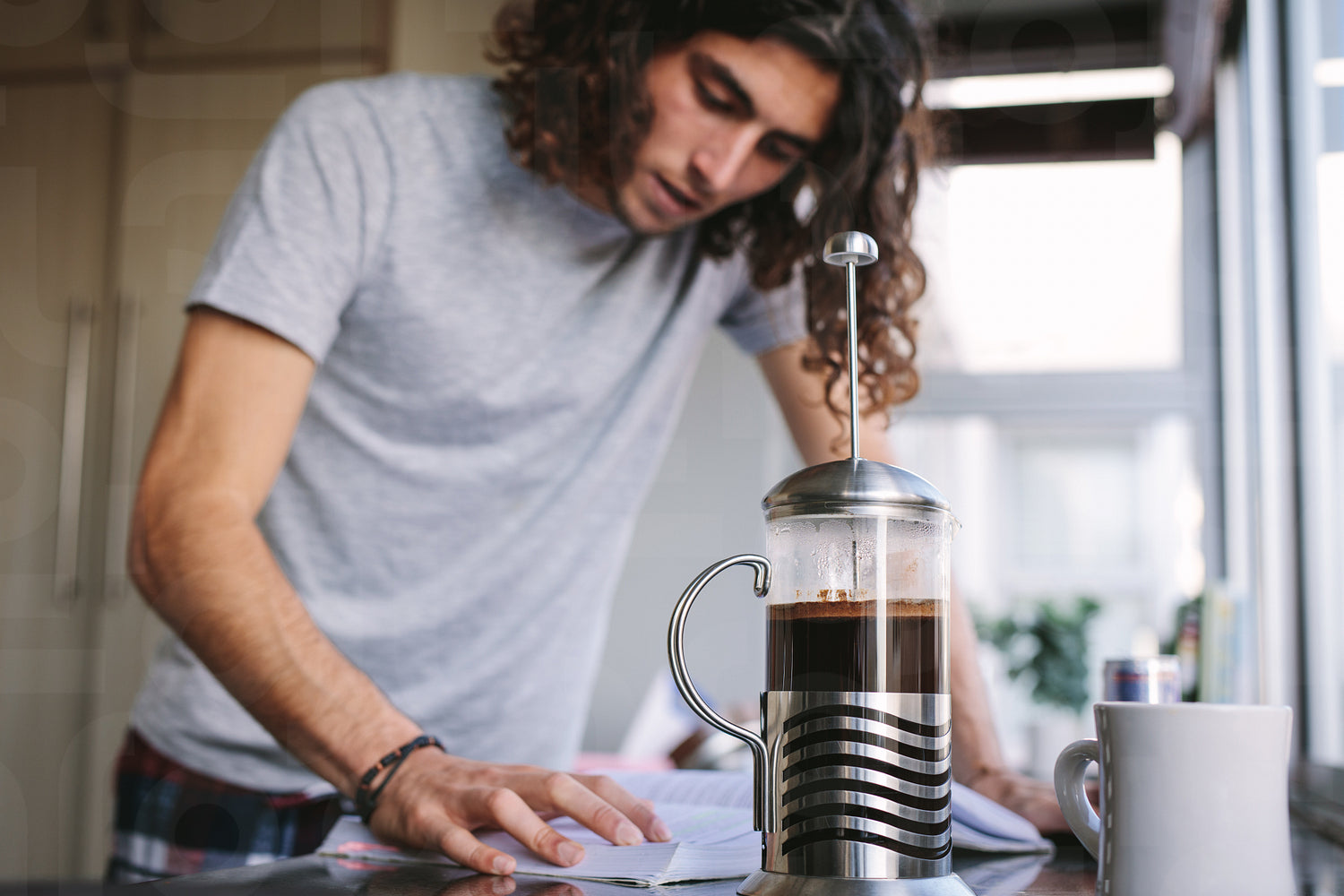 Young man reading book standing in kitchen at home while making coffee. Student standing in kitchen and studying for college exam.