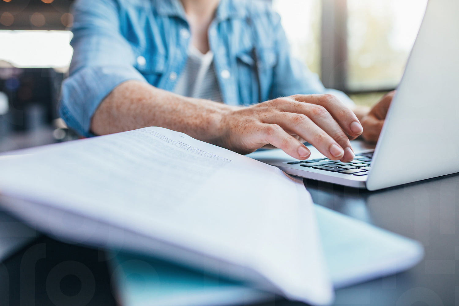 Close up of man hands typing on laptop. Male student working on laptop at library