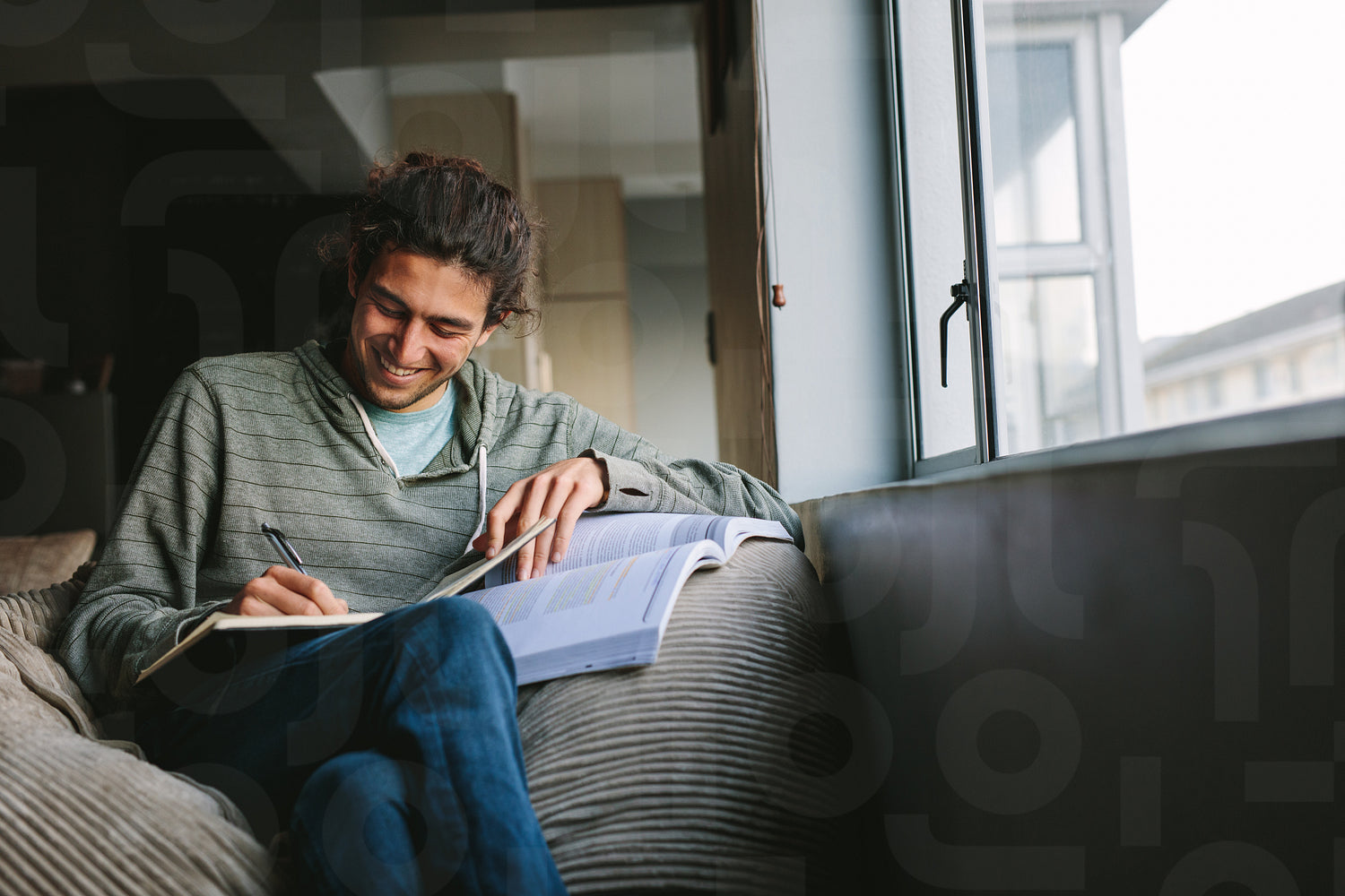 Smiling man sitting comfortably at home writing in a book. Student writing notes from a text book sitting on couch beside a window.