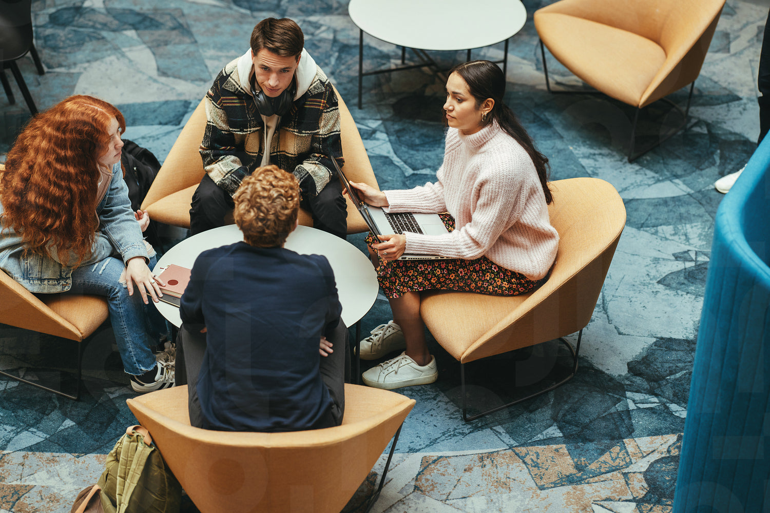 Teenagers at table working on project in college. Students in campus discussing on college presentation.
