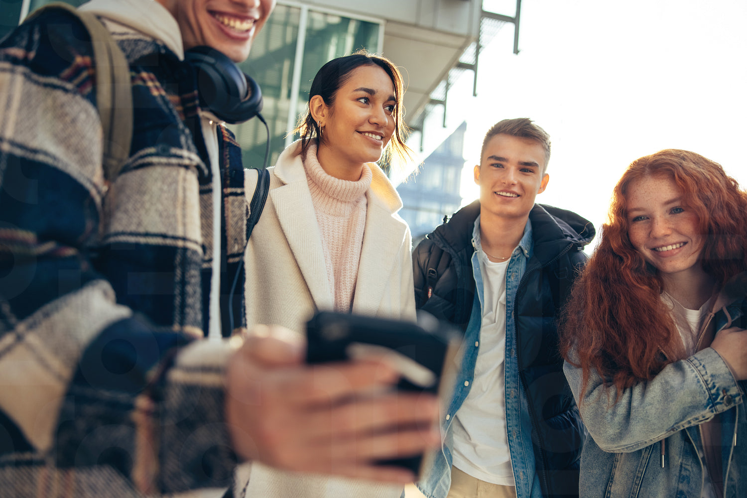 Group of people looking at a smart phone in hand of a friend. College students watching something interesting on a cell phone.