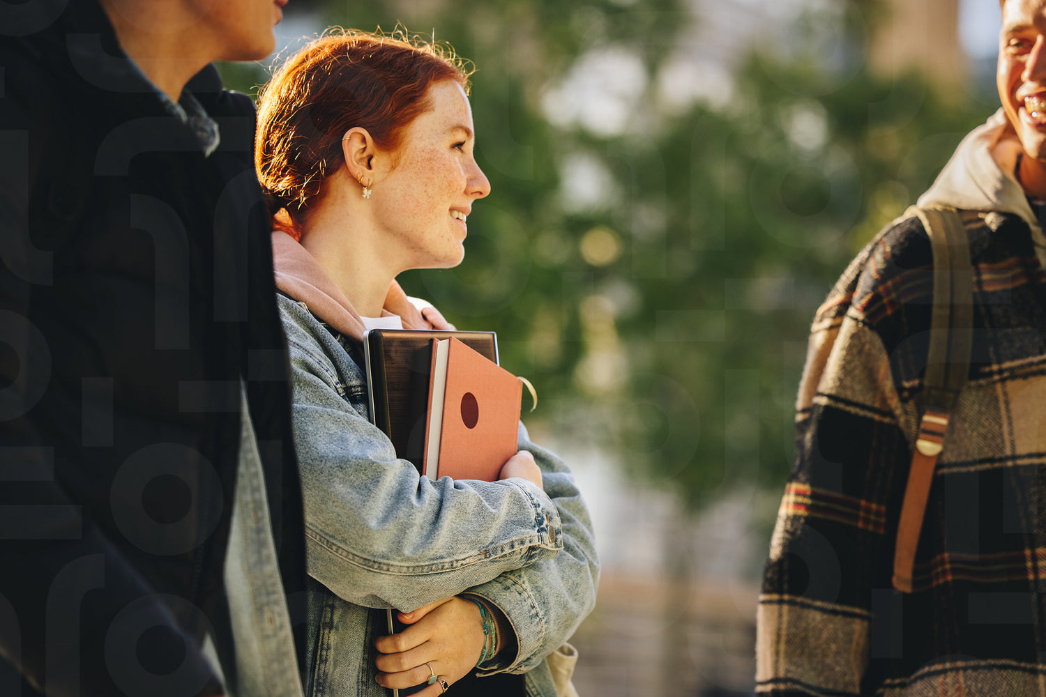 Happy students walking outside in college campus. Young people at high school campus walking together.