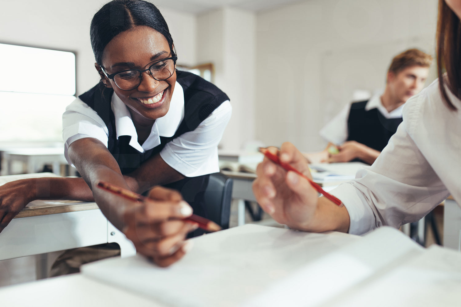 Girl helping a classmate in study in the classroom. High school girl in uniform studying in class.