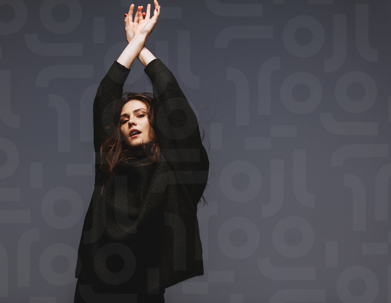 Stylish female fashion model posing against grey background with copy space. Attractive caucasian woman in black casual outfit with hands over her head and looking at camera.