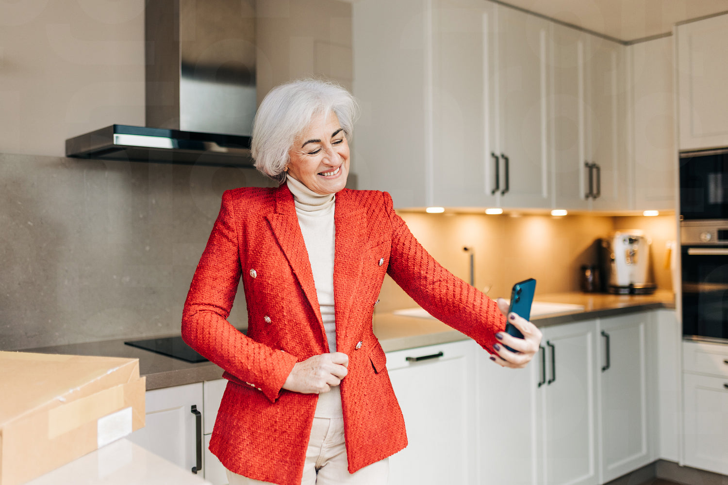 Stylish senior woman showing off her new jacket on a video call. Mature woman smiling cheerfully while trying on her new clothing. Online shopper feeling satisfied with her order after delivery.