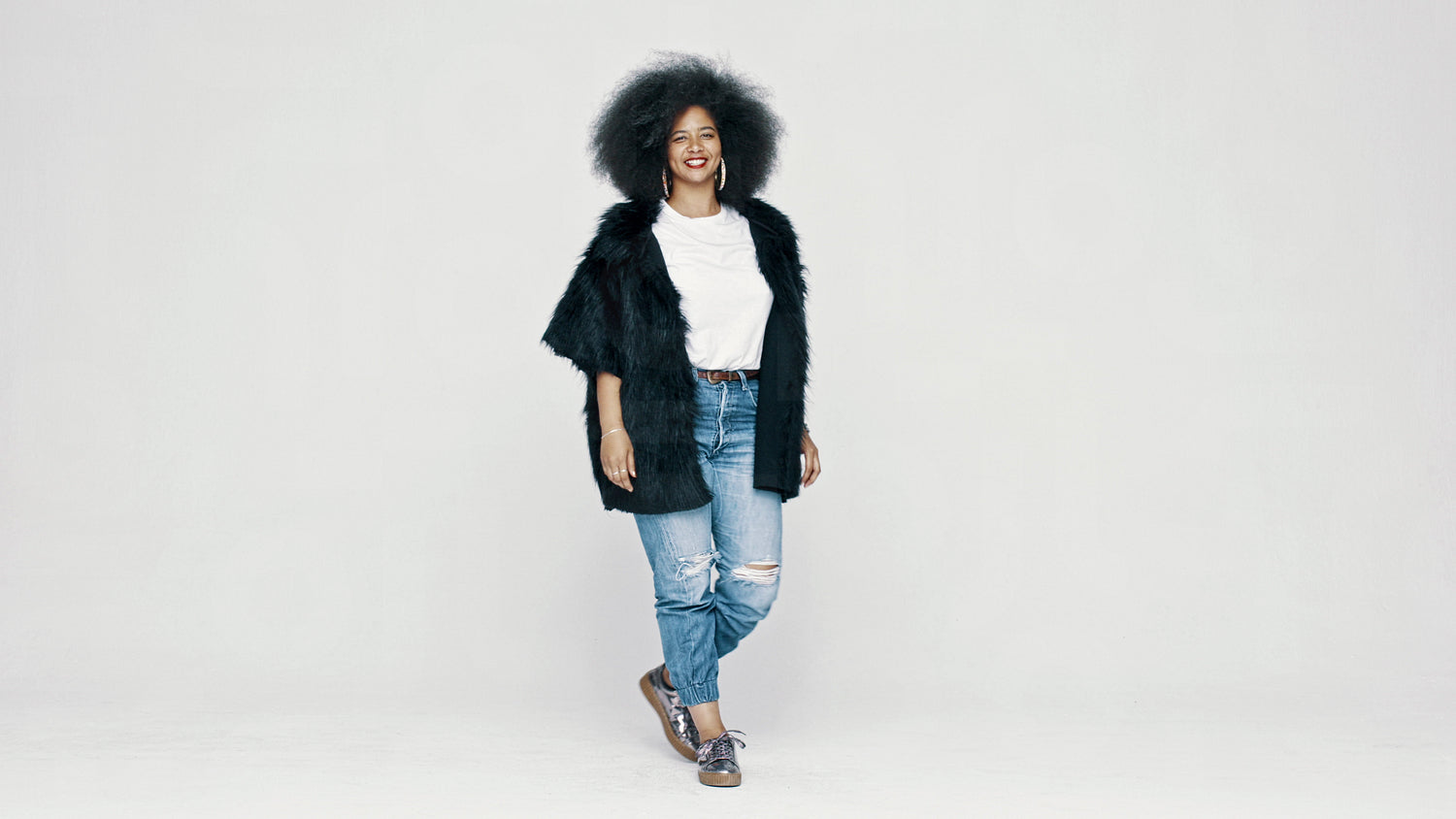 Fashionable woman in fur coat posing on white background. Full length of a woman in afro hairstyle.