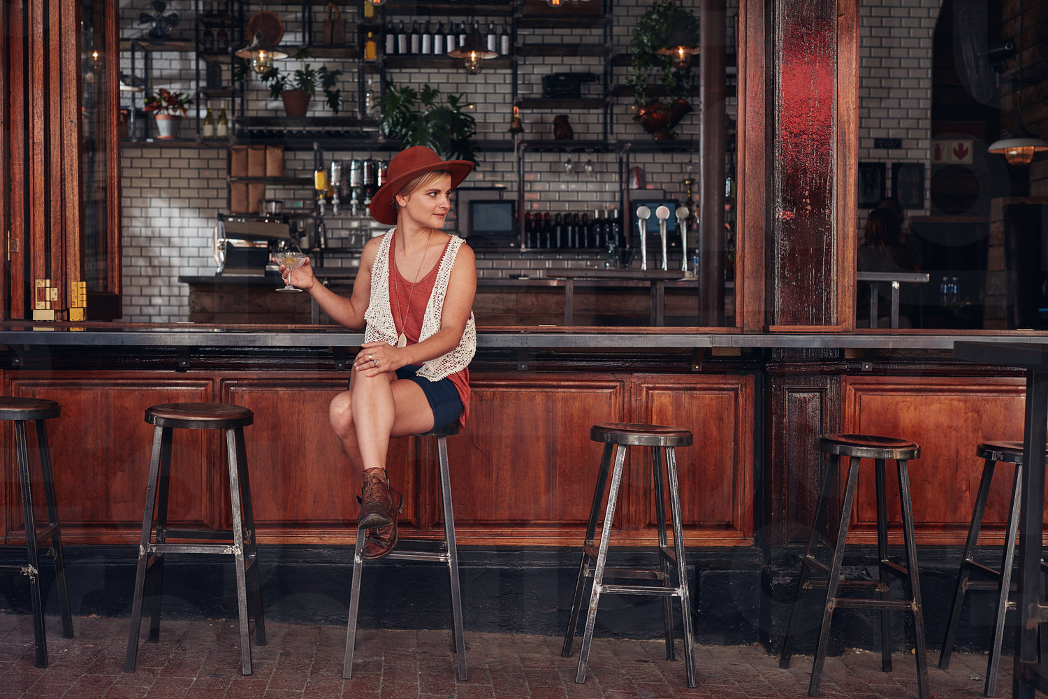 Portrait of stylish young female sitting at a cafe with drink and looking away. Beautiful caucasian female at coffee shop counter.