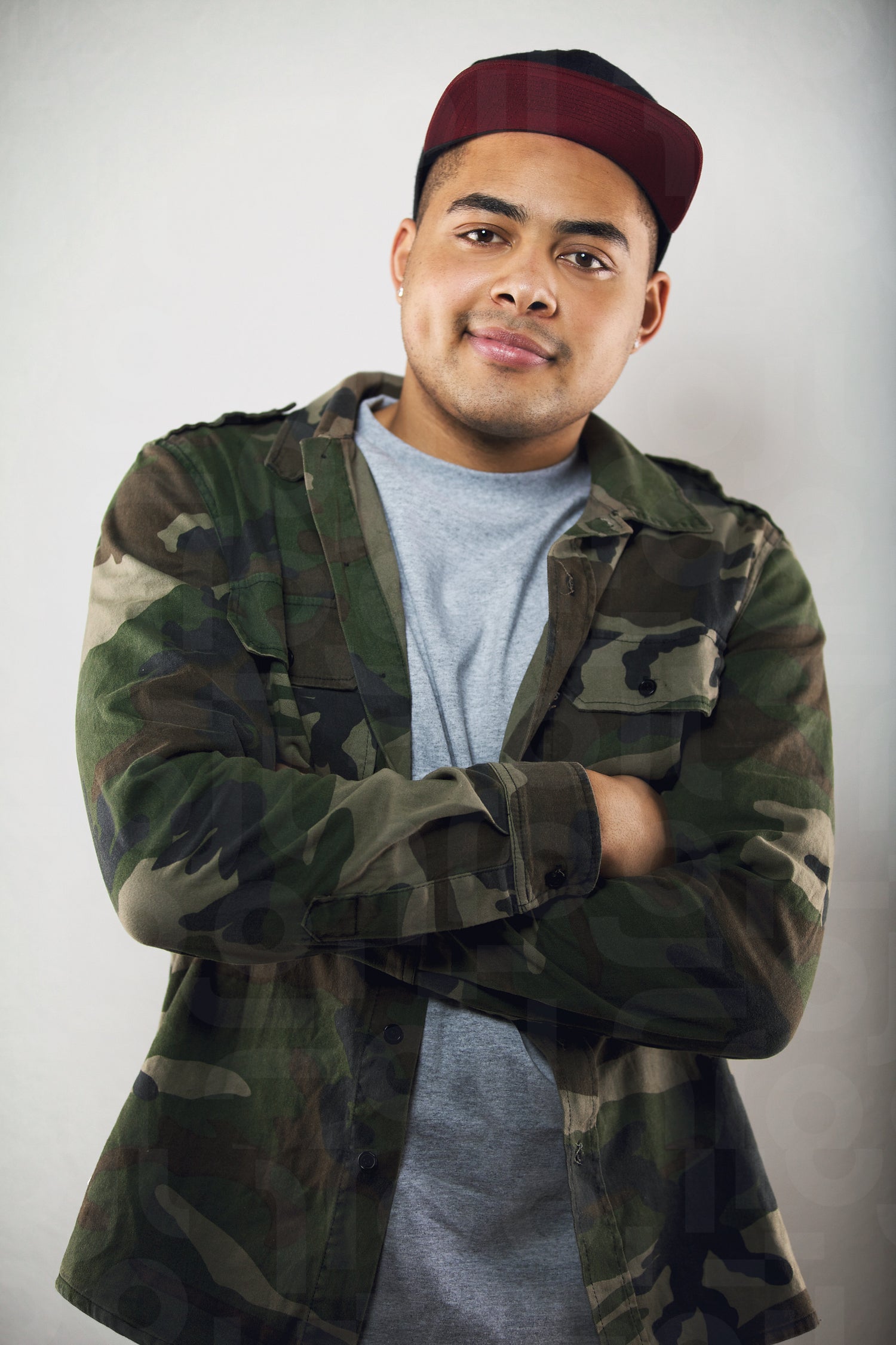 Handsome young man wearing camouflage jacket and cap with his arms crossed looking at camera with smile. Stylish young male model posing against grey background
