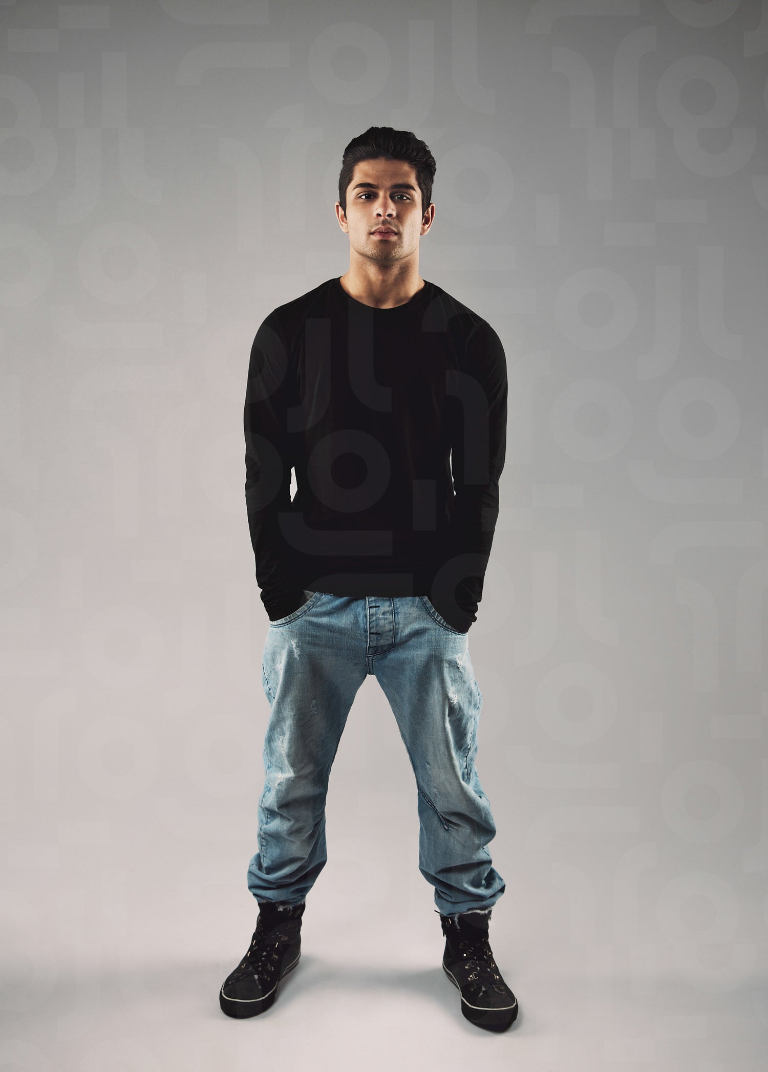 Full length portrait of stylish young man in casuals standing with his hands in pocket over grey background.
