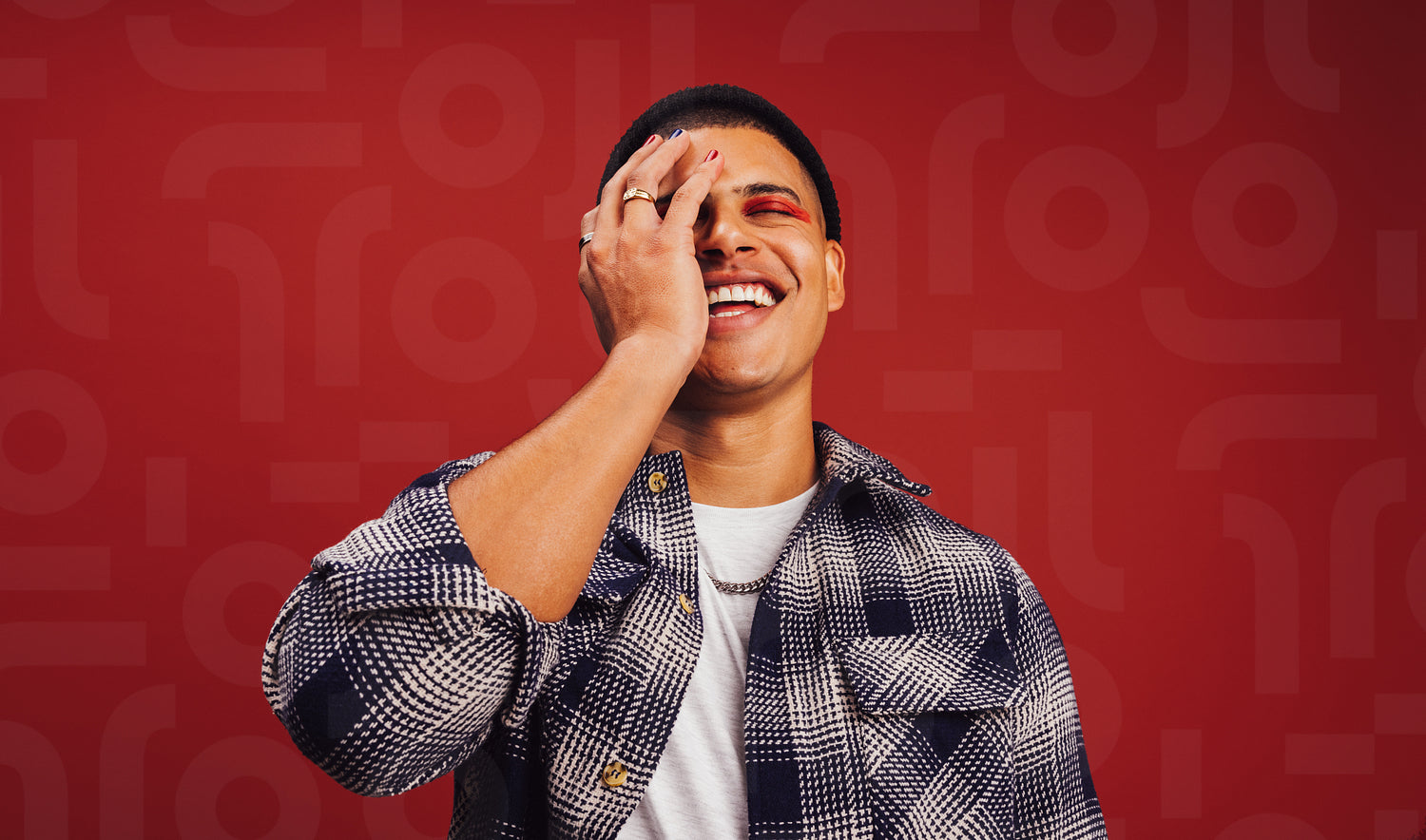 Stylish young man smiling cheerfully while standing against a red background. Fashionable young man wearing nail polish and eye shadow in a studio. Non-conforming young man embracing his style.