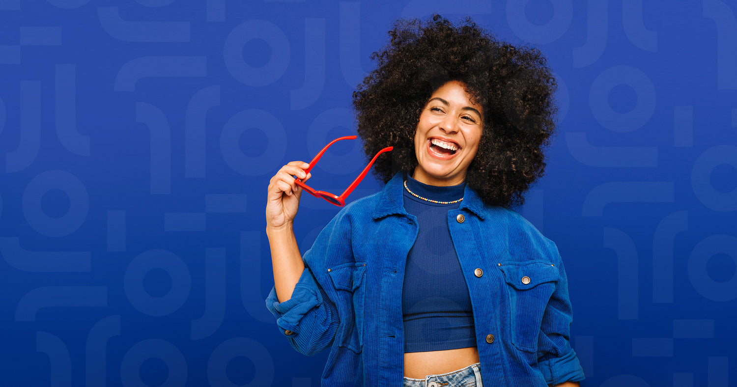 Stylish young woman smiling happily while holding trendy sunglasses in her hand. Beautiful woman with curly hair wearing fashionable casual clothing against a blue background.