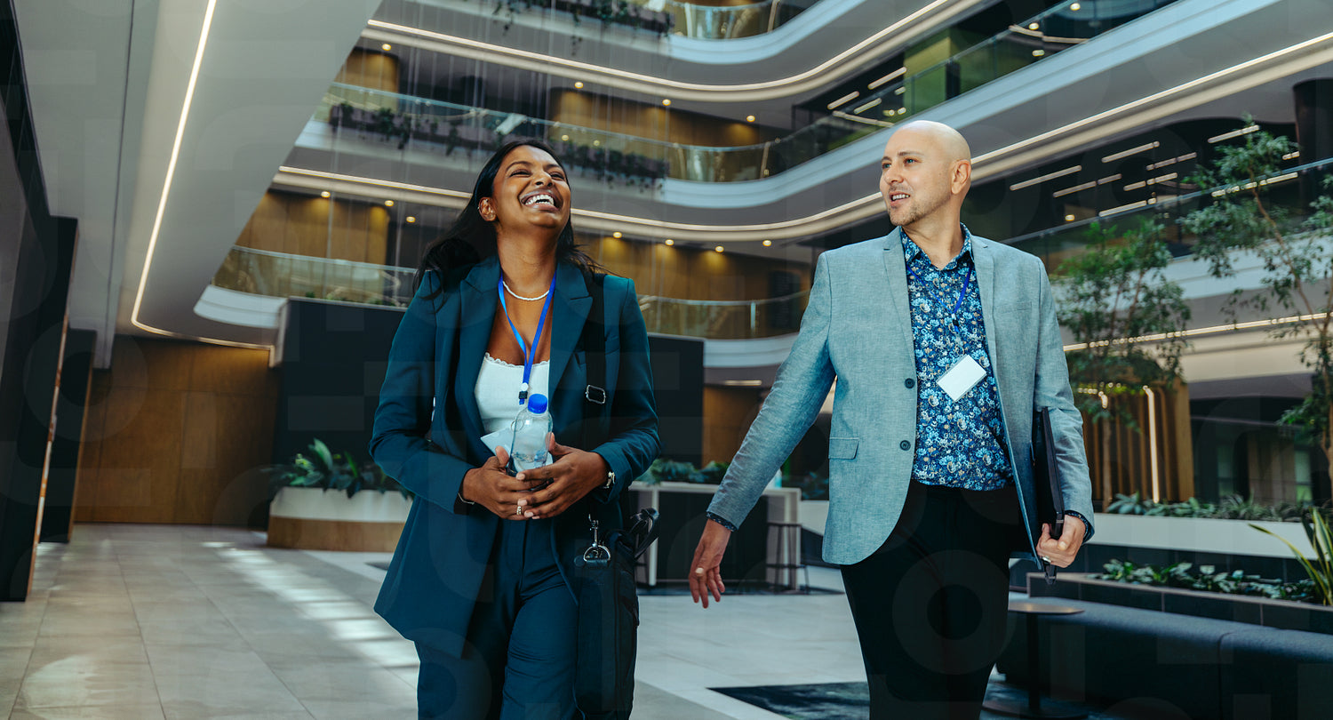 Successful accountants walking through a modern office, reflecting on business strategies and teamwork, embodying professional confidence and success.