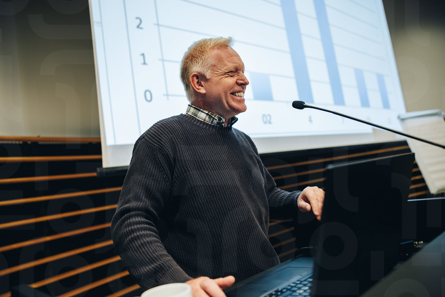 Businessman standing at podium with laptop giving a speech. Successful male business professional addressing a seminar.